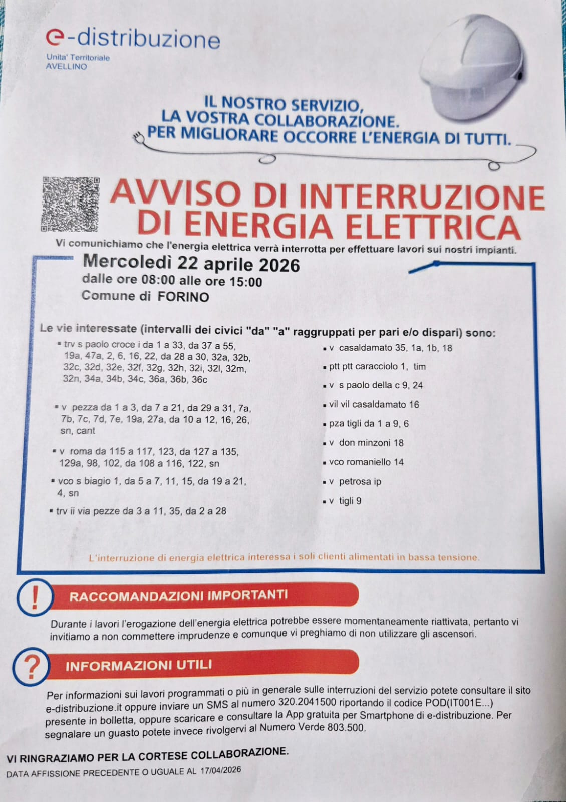 Si avvisa la Cittadinanza che e-distribuzione ha emanato l'allegato avviso di interruzione di energiaelettricaper mercoledi 22 aprile dalle 8:00 alle 15:00.